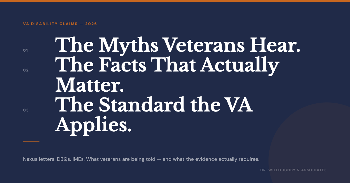 Dr. Willoughby and Associates is a practice of licensed PhD and PsyD psychologists who conduct psychological Independent Medical Examinations for veterans pursuing VA disability claims. We have a clear interest in this topic, and we want to name that directly.
