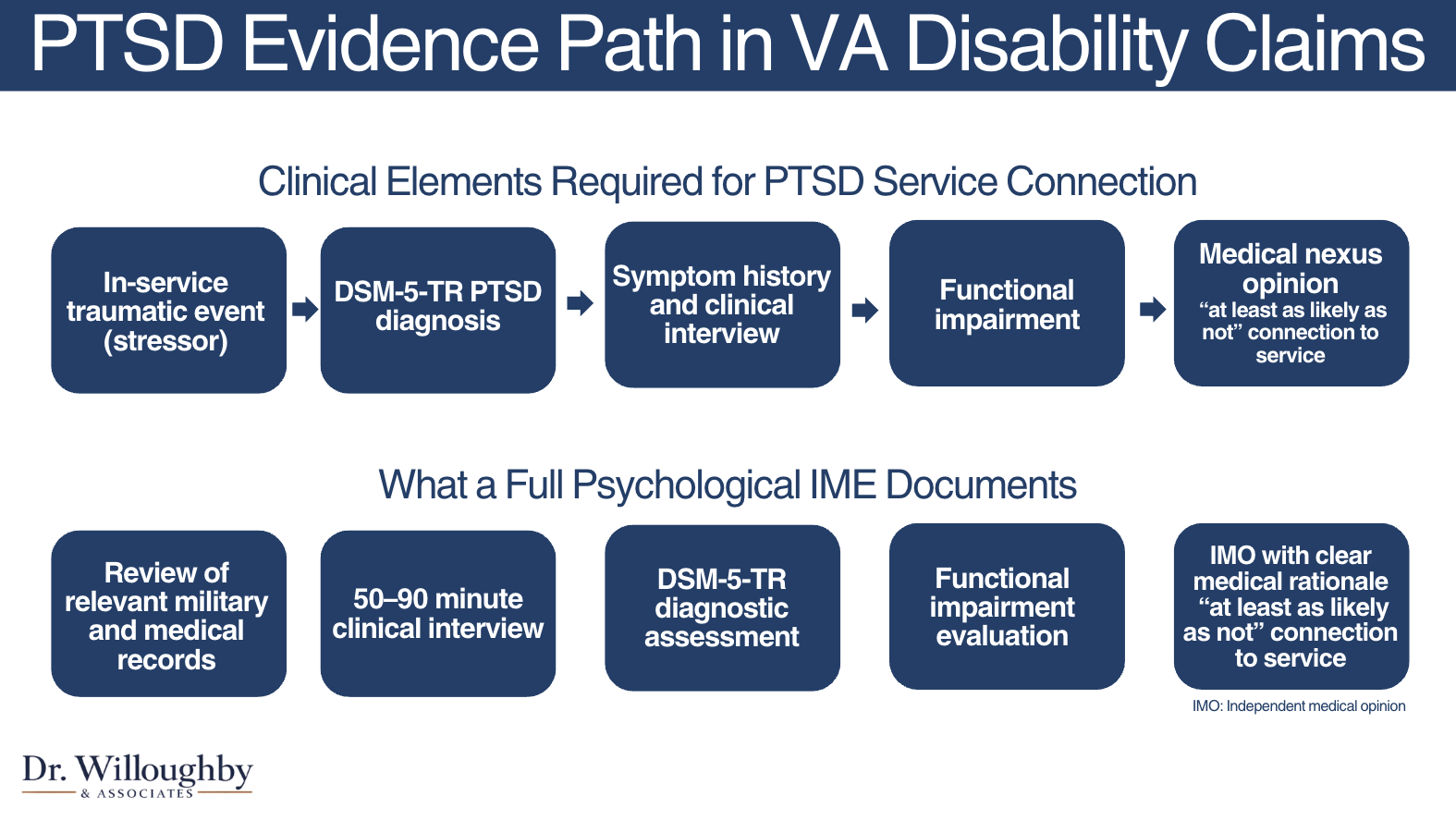 Dr. Willoughby & Associates is a specialized Independent Medical Examination practice focused on Veterans’ mental health VA disability claims. Our licensed PhD and PsyD clinicians conduct full psychological IMEs producing comprehensive medical evidence that connects conditions to military service when supported by the record.